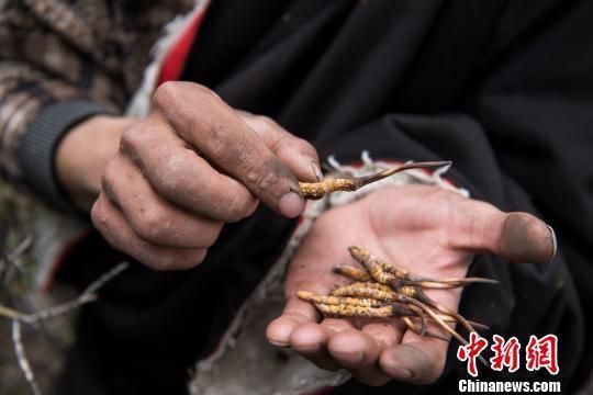 圖為近日,西藏農(nóng)牧民采挖到的蟲草?!『闻罾凇z